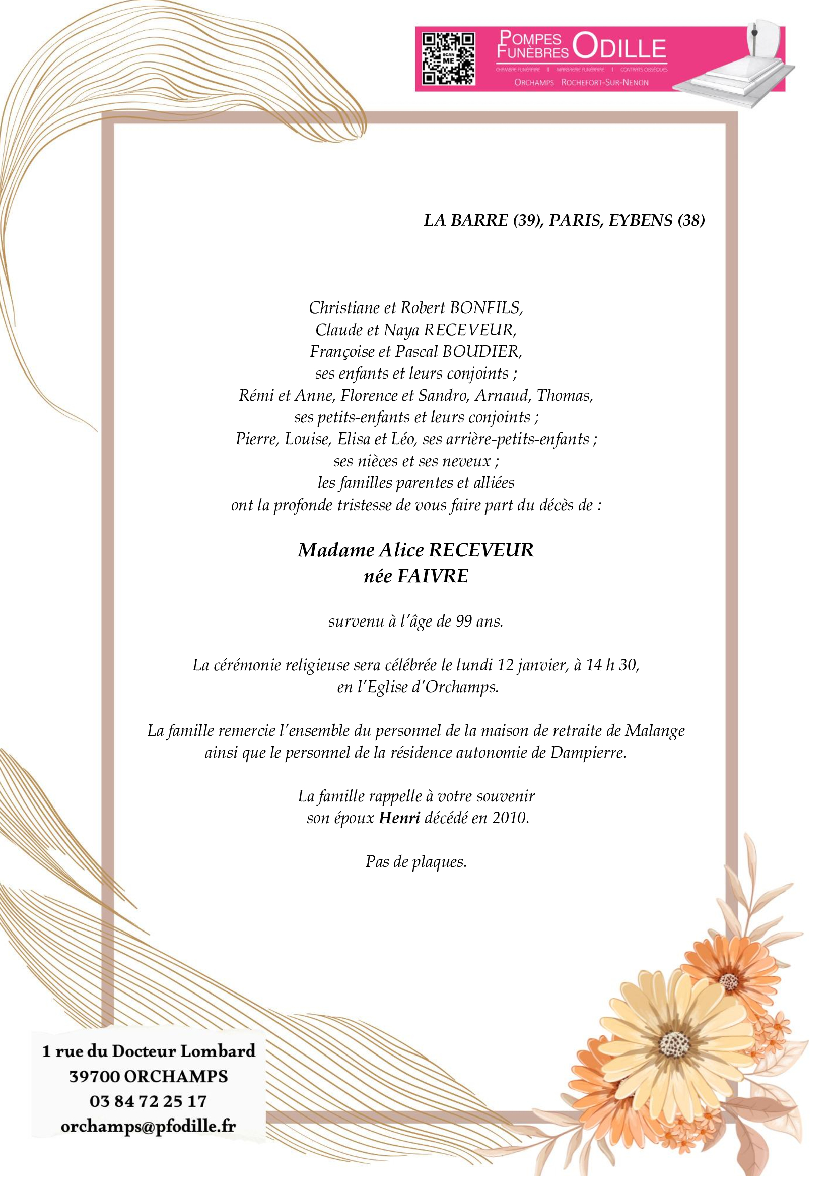 Nous vous invitons à utiliser cet espace pour laisser vos condoléances, partager des photos souvenirs, une anecdote ou exprimer vos pensées à travers des poèmes ou des textes. Cet endroit est un lieu d'expression dédié à honorer la mémoire d’Alice RECEVEUR.