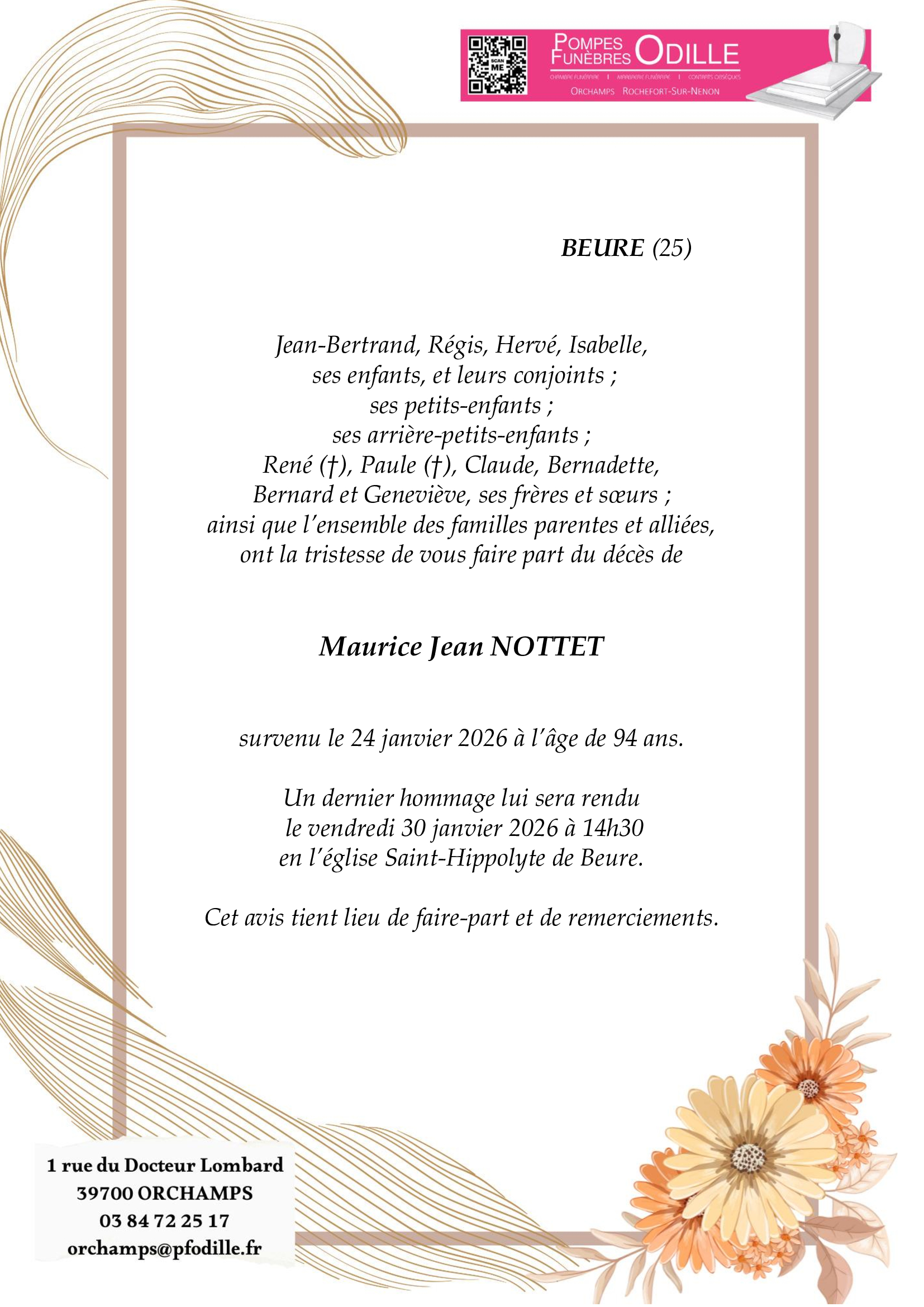 C’est avec une grande tristesse que nous vous annonçons le décès de Maurice NOTTET survenu le samedi 24 janvier 2026 à Besancon.